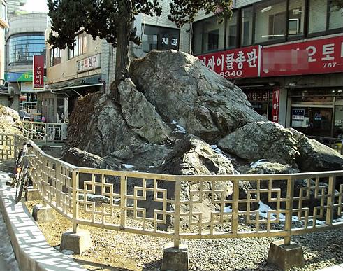 | ▲ 곤지암 바위 (광주=연합뉴스) 신립 장군의 전설이 얽힌 광주시 곤지암 바위. 주변 개발로 건물에 포위돼 바위 하단부와 연못이 복개된 상태다. 2013.8.29 [연합뉴스 자료사진. 재판매 및 DB 금지] |