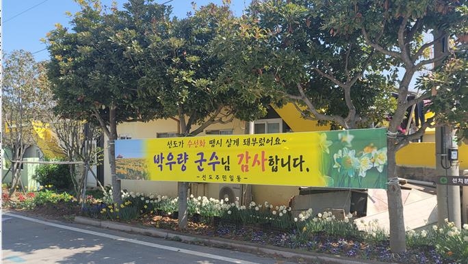 4일 찾은 선도 선착장에는 '선도가 수선화 땜시 살게 돼부렀어요~'라는 플래카드가 걸렸다.