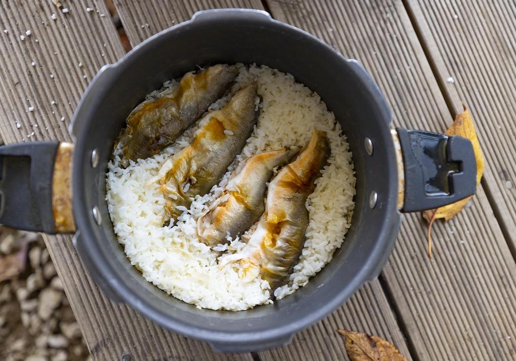 압력밥솥에 씻은 쌀을 넣고 그 위에 숯불에 바싹 구운 은어 4마리를 얹었다.