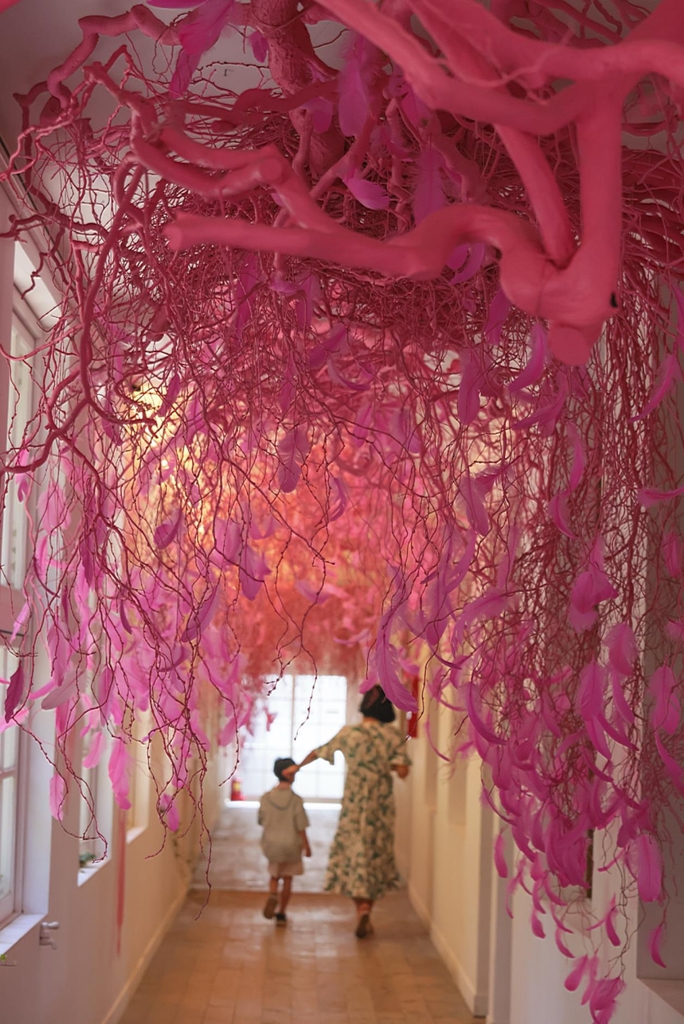 폐교 복도 천장을 가득 채운 것은 핑크빛 나무들이다.