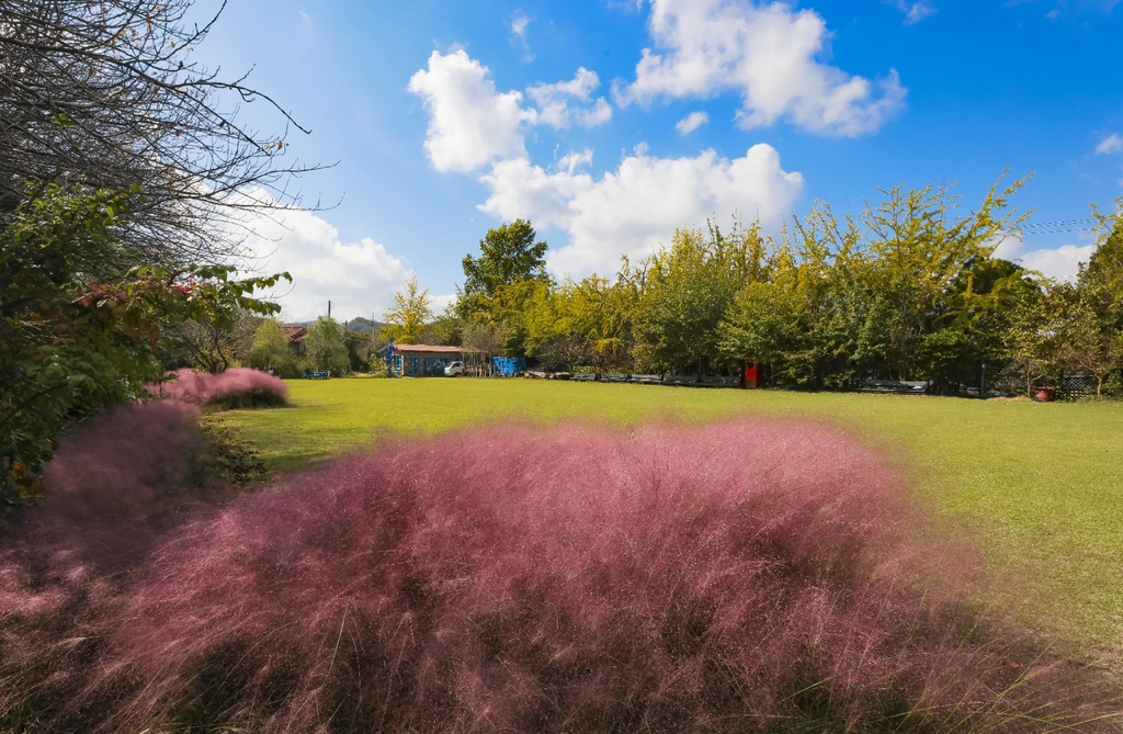 | ▲ 잔디와 어우러진 핑크뮬리 [사진/성연재 기자] |