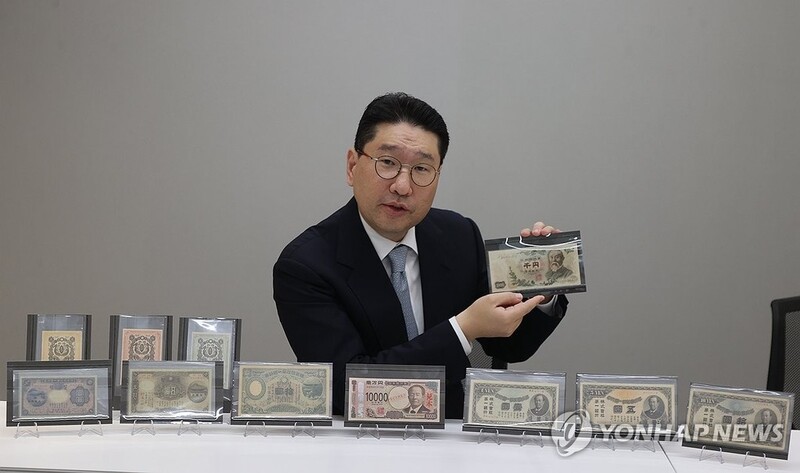 | ▲ 일본 제일은행권과 새 만 엔권에 실린 시부사와 에이이치 (서울=연합뉴스) 류효림 기자 = 이상현 태인 대표 겸 안중근의사숭모회 이사가 2일 서울 강남구 청담동 태인 사무실에서 1902∼1909년에 발행된 일본 제일은행권(오른쪽)과 이달부터 발행하는 일본 만 엔권 견본을 비교해 설명하고 있다. 두 지폐에는 과거 한반도 경제 침탈에 앞장선 시부사와 에이이치(澁澤榮一)가 실려있다. 2024.7.2 ryousanta@yna.co.kr |