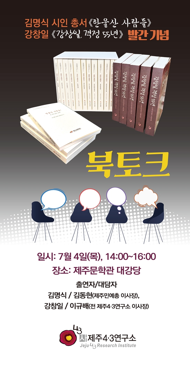 (제주=연합뉴스) 제주4·3연구소는 4일 제주문학관에서 김명식 시인 '한울산 사람들', 강창일 전 국회의원 '강창일, 격정 55년' 발간 기념 북토크를 개최한다.