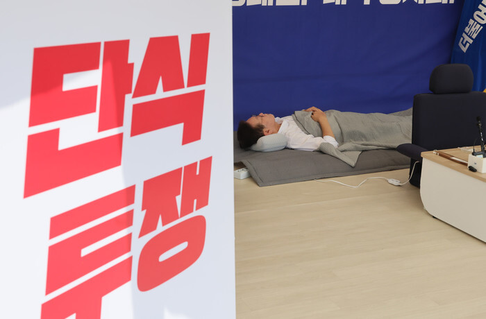 Lee Jae-myung, leader of the main opposition Democratic Party, lies down inside the National Assembly in Seoul as he stages a hunger strike for the 14th day in a row, in this file photo dated Sept. 10, 2023. Lee, the party's candidate, was certain to win the presidential election on June 3, 2025, triggered by the ouster of former President Yoon Suk Yeol over his botched imposition of martial law. (Yonhap)