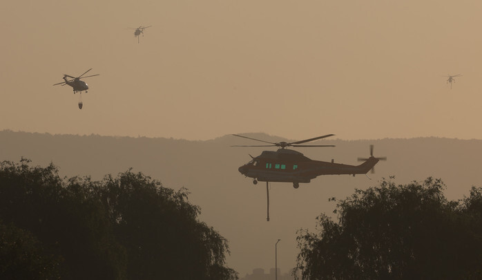 Firefighting helicopters fly toward Mount Hamji in the southeastern city of Daegu on April 29, 2025, following a wildfire that broke out the previous day. (Yonhap)