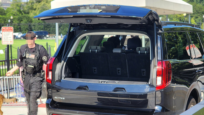 A security guard inspects a vehicle of a South Korean trade delegation, comprising Finance Minister Koo Yun-cheol, Industry Minister Kim Jung-kwan and Trade Minister Yeo Han-koo, at the entrance to the West Wing of the White House in Washington, D.C., on July 30, 2025. U.S. President Donald Trump said the same day that he will meet the delegation in the afternoon to listen to their "offer to buy down" the proposed 25 percent "reciprocal" tariffs. (Yonhap)