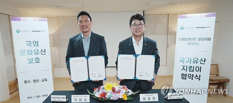 국가유산청은 1일 서울 경복궁 흥복전에서 스마일게이트 RPG와 국외 문화유산 보호를 위한 '국가유산지킴이' 협약을 체결한다고 밝혔다.