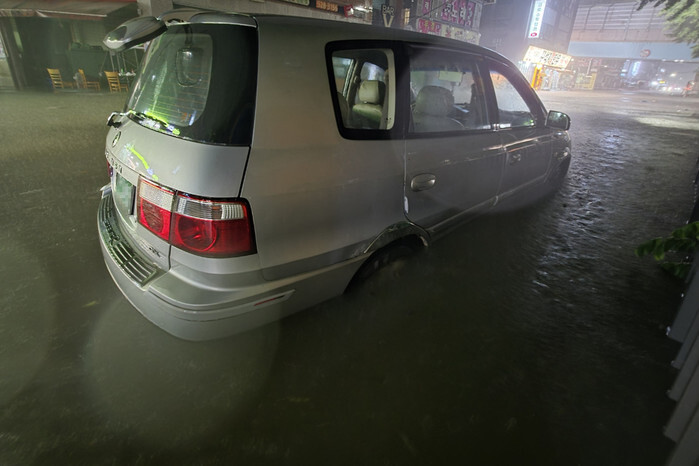 A passenger car is left stranded on a flooded road in the southwestern city of Gwangju on Aug. 3, 2025, amid a heavy rain warning issued in the region, in this provided photo. (PHOTO NOT FOR SALE) (Yonhap)