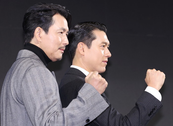 South Korean actors Hyun Bin (R) and Jung Woo-sung, who star in the new drama "Made in Korea," an original series by Disney+, pose for a photo during a publicity event in Seoul on Dec. 15, 2025. The first episode of the series will be available on Dec. 24. (Yonhap)