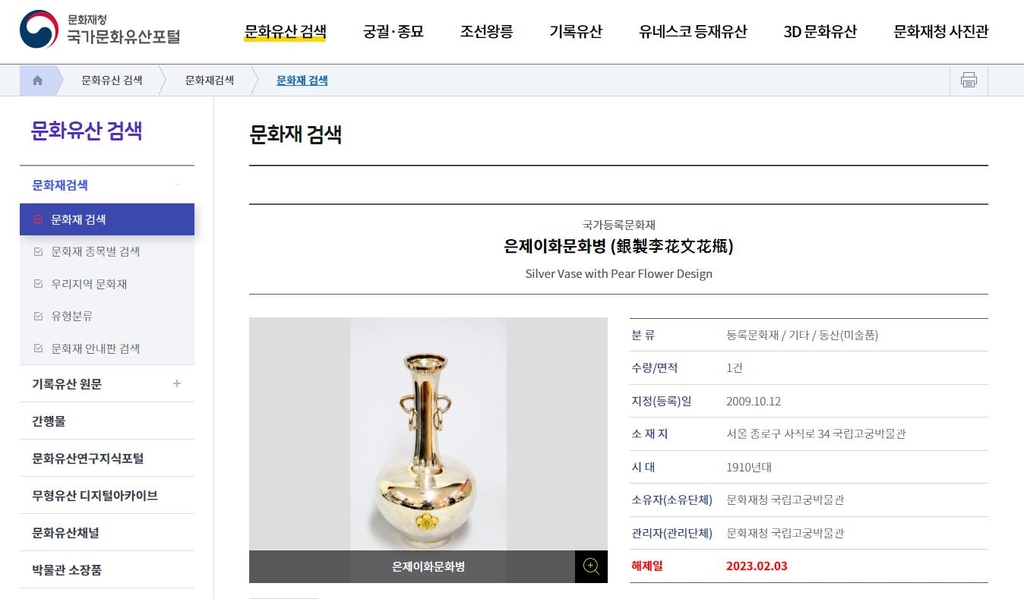 7일 학계 등에 따르면 문화재청은 이달 초 관보를 통해 국가등록문화재인 '은제이화문화병'(銀製李花文花甁)의 문화재 등록을 말소한다고 고시했다.