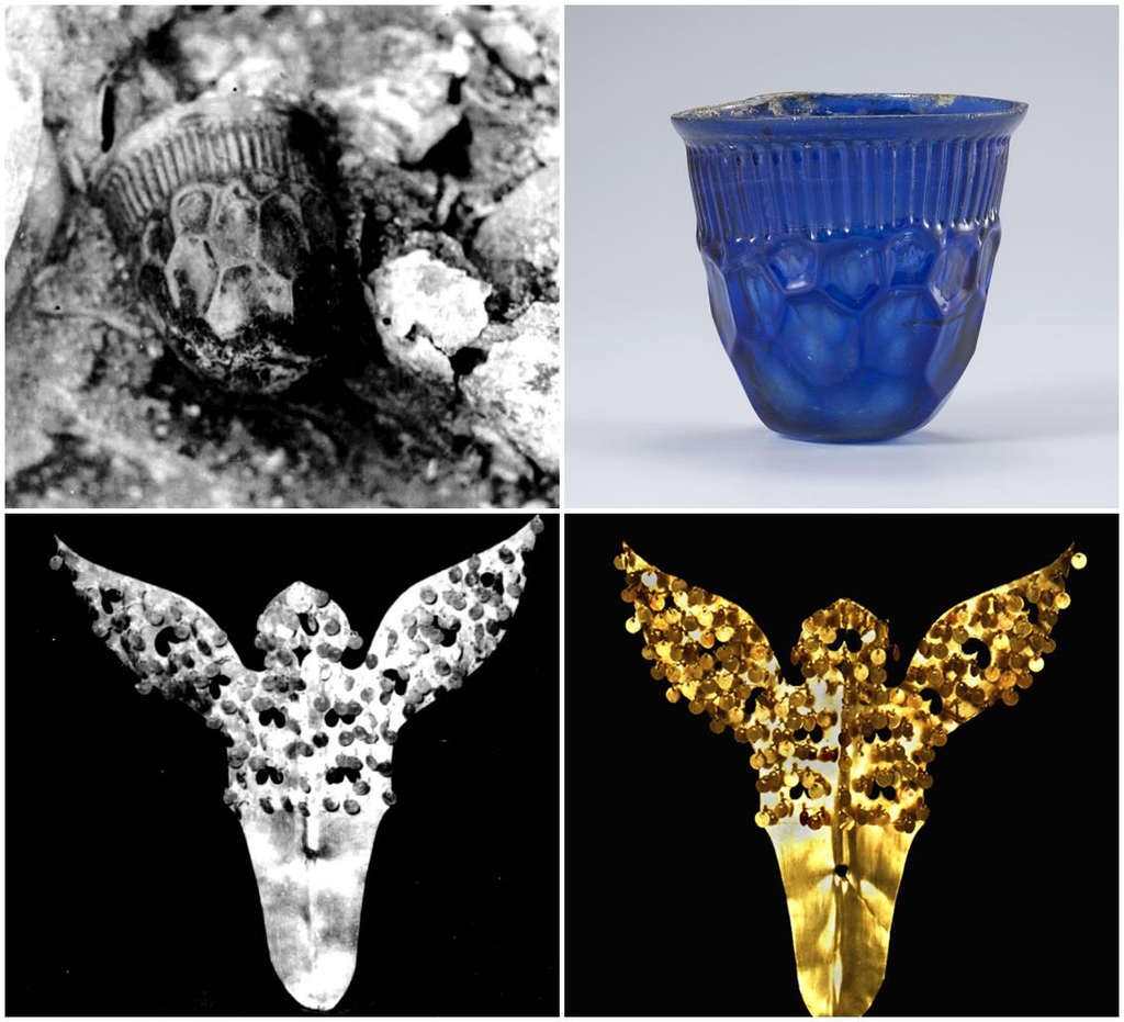 | ▲ 보물 '천마총 유리잔'과 '천마총 금제 관식' 1973년 발굴 조사 보고서에 실린 사진과 현재 모습. [문화재청 국가문화유산포털 제공. 재판매 및 DB 금지] |