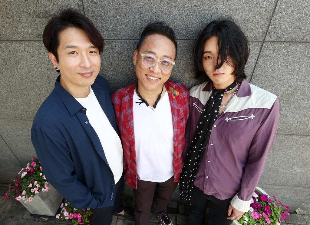 | ▲ 우리는 '공중전화' (서울=연합뉴스) 이재희 기자 = 밴드 공중전화 멤버들이 지난 21일 서울 강남구의 한 스튜디오 건물에서 연합뉴스와 인터뷰를 하기 전 포즈를 취하고 있다. 왼쪽부터 보컬 이대희. 리더 송현호, 신곡 '댄스 투나잇'(Dance Tonight)에 참여한 일본인 보컬 바이비(Bybe·본명 후쿠이 마사시), 2022.6.21 scape@yna.co.kr |