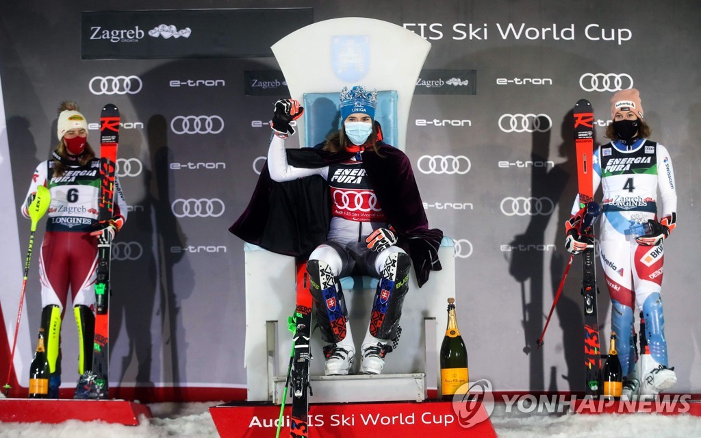 블로바는 자그레브 월드컵 우승자에게 주는 '스노 퀸' 왕관을 쓰고 시상식에서 왕좌에 앉았다.