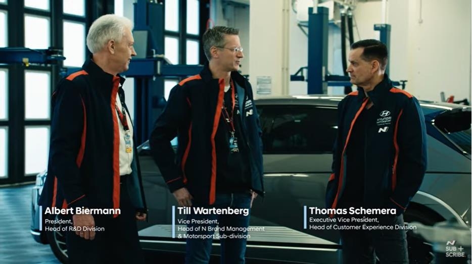 현대차가 전날 공개한 아반떼 N 월드 프리미어 영상에서는 아반떼 N을 소개하는 영상이 모두 끝난 뒤 알버트 비어만 연구개발본부장(사장)과 토마스 쉬미에라 고객경험본부장(부사장), 틸 바텐베르크 N브랜드매니지먼트모터스포츠사업부장(상무)이 등장한다.