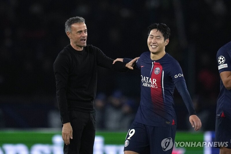 | ▲ 루이스 엔리케 감독으로부터 축하받는 이강인 [AP=연합뉴스] |