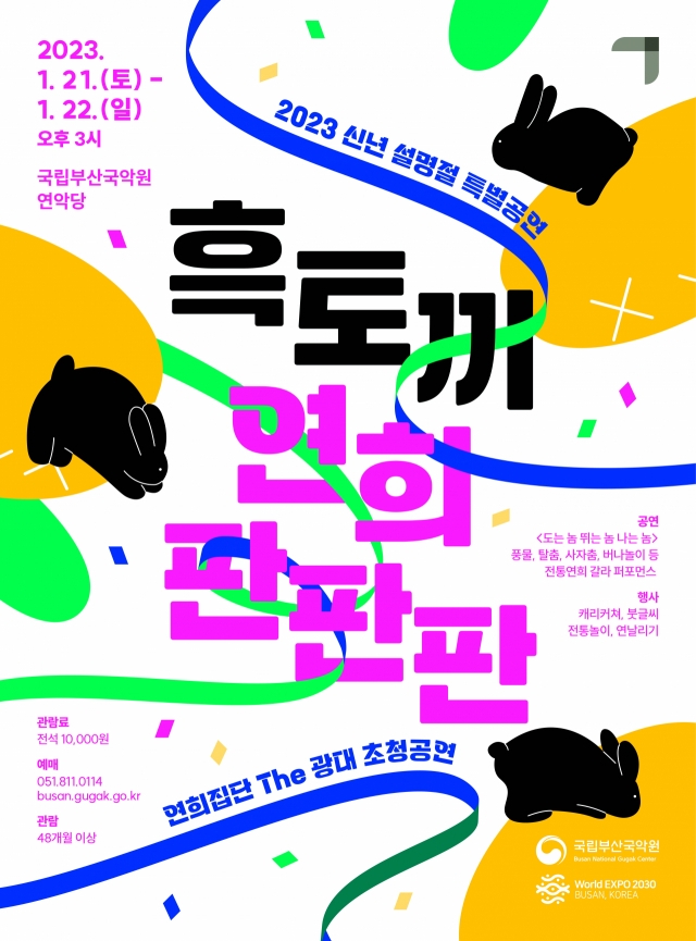 국립부산국악원은 21∼22일 전국을 무대로 활동하는 '연희집단 The 광대'를 초청해 '흑토끼 연희 판판판'을 공연한다.