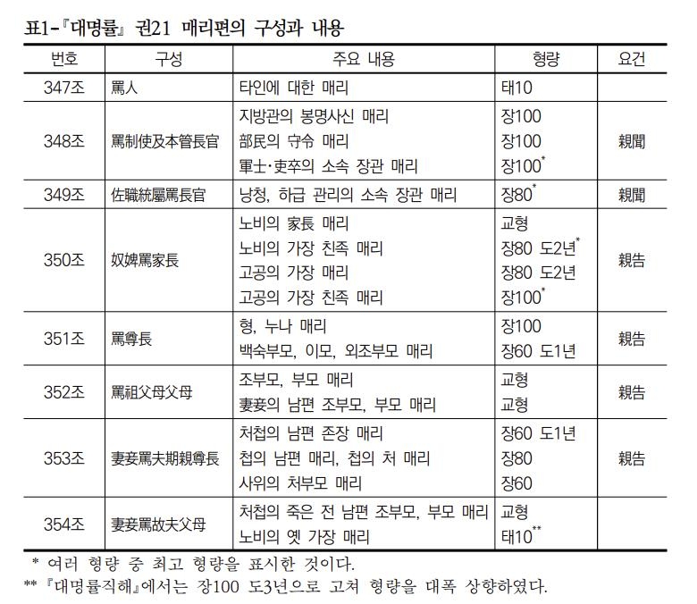 | ▲ '대명률'에 나오는 주요 매리 행위와 형량을 정리한 것 심재우 한국학중앙연구원 한국학대학원 교수의 '조선시대 매리 범죄의 처벌과 입법 양상' 연구 보고서 부분 [한국학중앙연구원 제공. 재판매 및 DB 금지] |