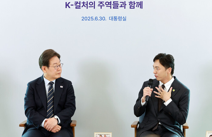 President Lee Jae Myung (L) listens to Tony award-winning musical writer Hue Park during a meeting with prominent figures from the cultural and art sectors at the presidential office in Seoul on June 30, 2025. Park wrote the Korean original musical "Maybe Happy Ending," which won six awards, including Best Musical, at this year's Tony Awards. (Pool photo) (Yonhap)