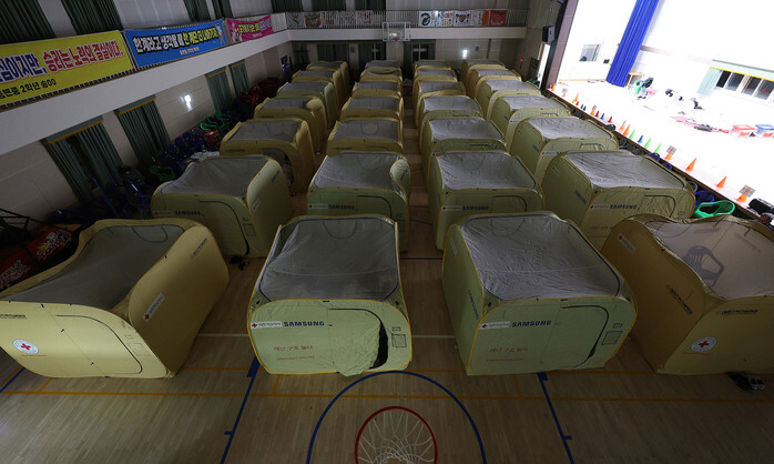 This photo, taken April 29, 2025, shows a middle school auditorium used as a shelter for evacuees in the southeastern city of Daegu, following a wildfire that broke out the previous day in the city. (Yonhap)