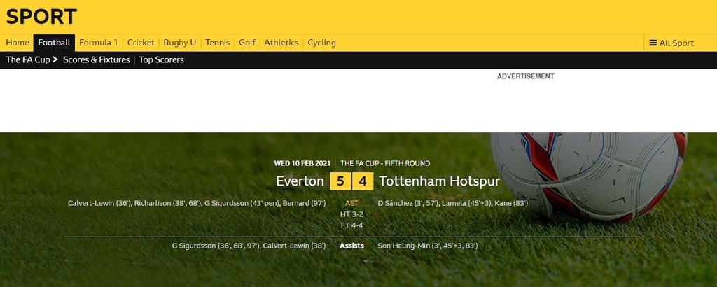 손흥민은 11일(한국시간) 영국 리버풀의 구디슨 파크에서 열린 에버턴과 2020-2021 FA컵 5라운드(16강전)에 선발 출전해 120분 풀타임을 뛰면서 2도움을 비롯해 토트넘이 터트린 4골에 모두 관여했지만, 팀의 4-5 패배로 아쉬움을 남겼다.