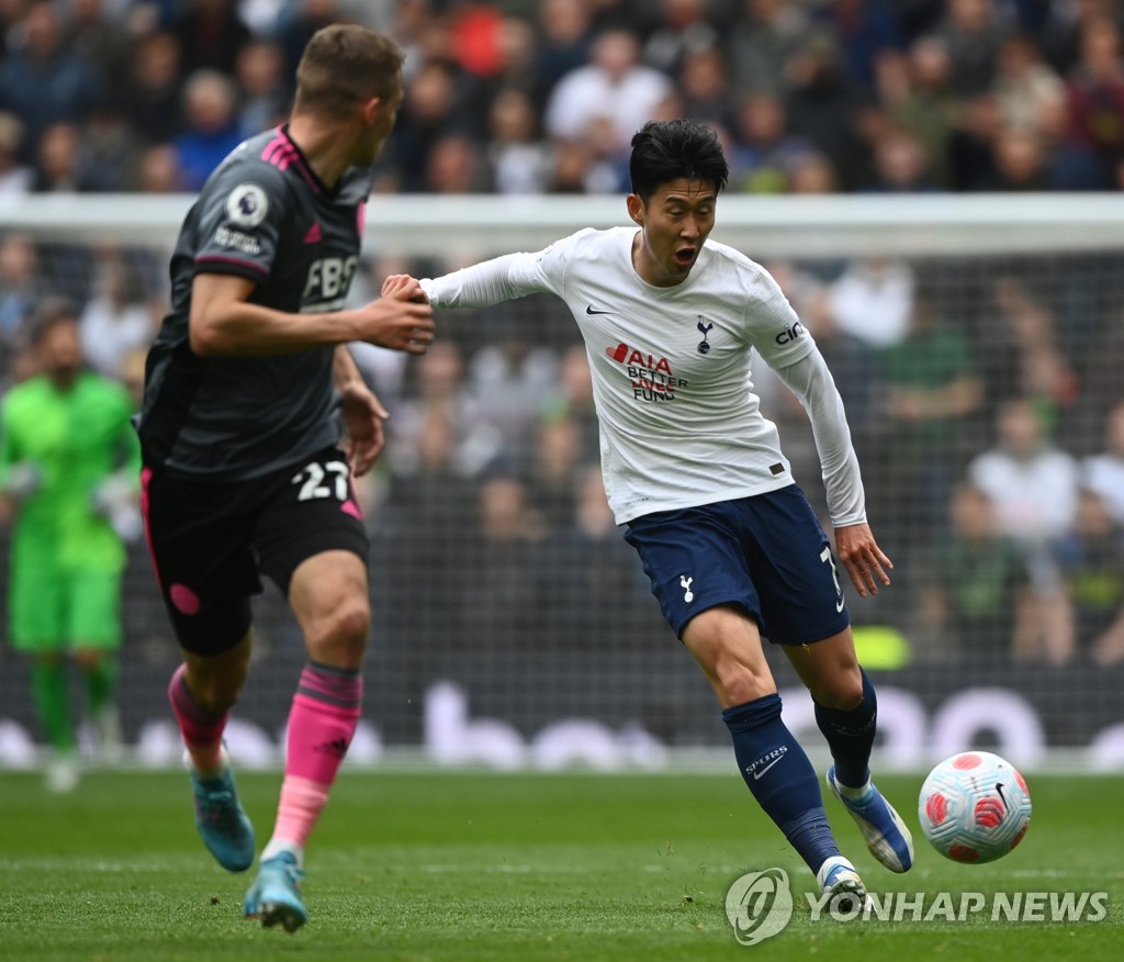 | ▲ In this EPA photo, Son Heung-min of Tottenham Hotspur (R) is in action against Timothy Castagne of Leicester City during the clubs' Premier League match at Tottenham Hotspur Stadium in London on May 1, 2022. (Yonhap) |