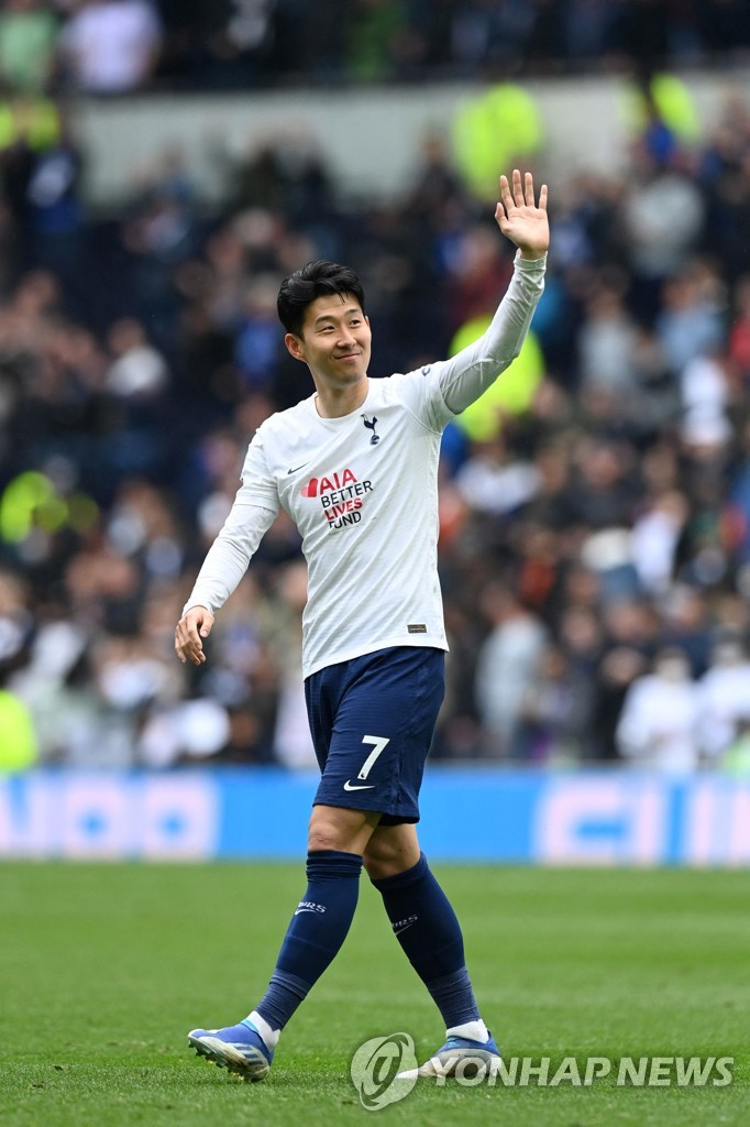 | ▲ In this AFP photo, Son Heung-min of Tottenham Hotspur waves to the crowd as he leaves the pitch following a 3-1 victory over Leicester City in the clubs' Premier League match at Tottenham Hotspur Stadium in London on May 1, 2022. (Yonhap) |