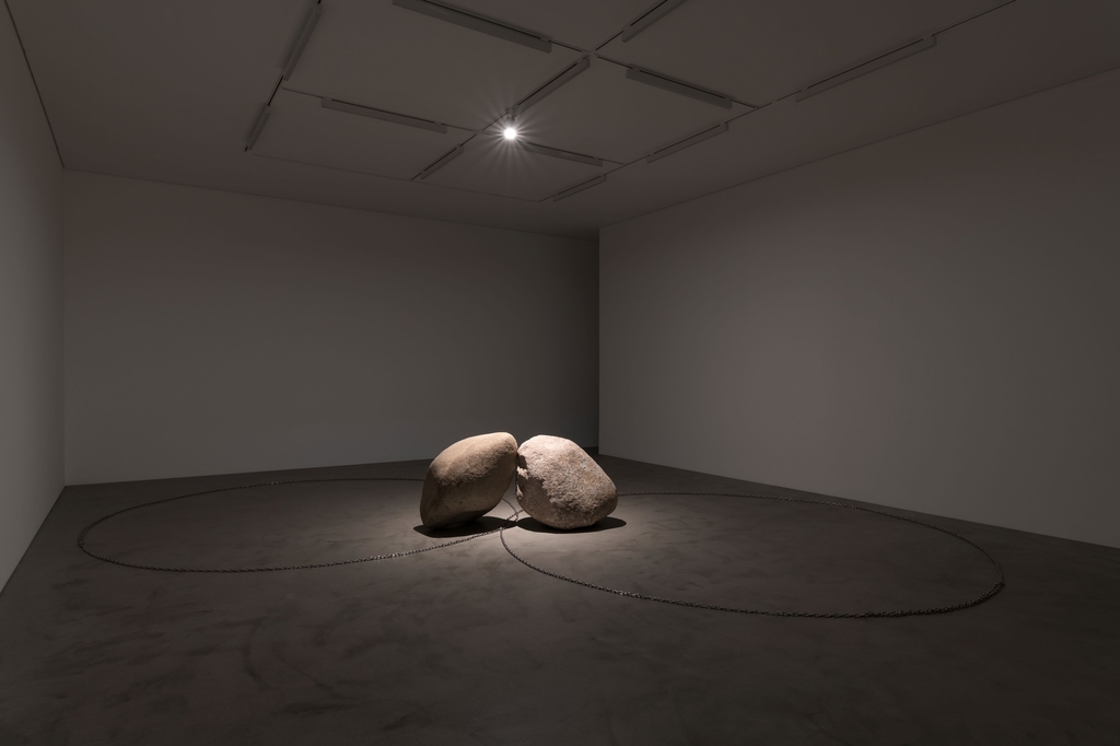 '키스'라는 부제의 신작은 사람으로 암시되는 두 개의 돌이 마치 키스하듯이 붙어 있고 이들을 둘러싼 두 개의 쇠사슬 역시 포개지고 교차하는 작품이다.