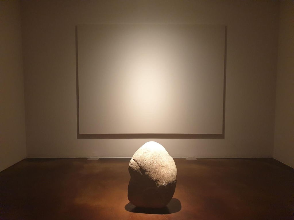빈 캔버스 앞에 돌을 배치한 작품에는'∼인 것 같다'는 의미의 영어 단어 '심'(Seem)이란 부제가 붙었다. 그저 캔버스 앞에 돌을 뒀을 뿐인데 돌이 캔버스를 바라보고 있는 것 같기도, 두 사물이 대화를 나누고 있는 것 같기도 하다.