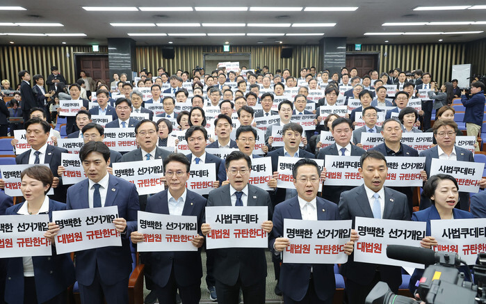 Park Chan-dae (C, 1st row), acting leader of the liberal Democratic Party (DP), and the party's other lawmakers chant slogans to condemn the Supreme Court during an emergency meeting at the National Assembly in Seoul on May 1, 2025, after the top court ordered the high court to reexamine the party's presidential candidate Lee Jae-myung's acquittal on election law violation charges. (Yonhap)