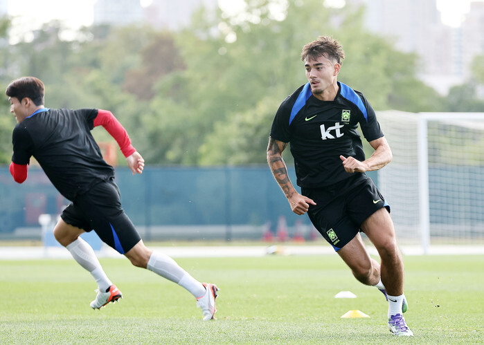 Jens Castrop (R) of South Korea, the first foreign-born player of mixed blood called up to the team, trains at Icahn Stadium on Randall's Island in New York City on Sept. 2, 2025, ahead of his team's friendly match against the United States on Sept. 7. (Yonhap)