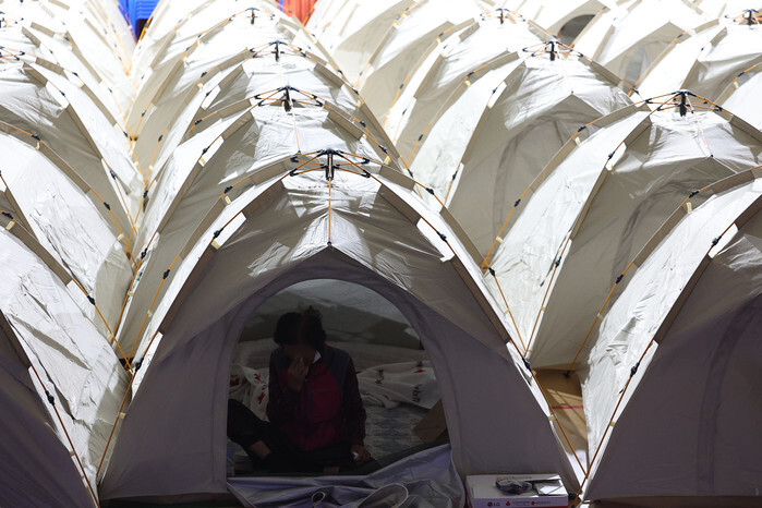 A resident takes a rest inside a tent at an elementary school used as a shelter for evacuees in the southeastern city of Daegu on April 29, 2025, following a wildfire that broke out the previous day in the city. (Yonhap)