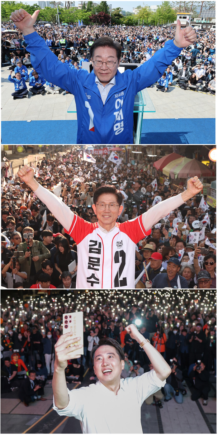 This combined photo taken May 12, 2025, shows the presidential candidates of South Korea's major political parties -- (top to bottom) Lee Jae-myung of the liberal Democratic Party, Kim Moon-soo of the conservative People Power Party and Lee Jun-seok of the minor conservative New Reform Party -- making stump speeches in Hwaseong, south of Seoul; the southeastern city of Daegu; and Seoul, respectively. The 22-day official campaign period for the June 3 presidential election kicked off the same day. (Yonhap)