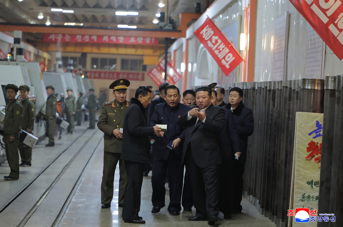 North Korean leader Kim Jong-un (R, front) inspects the production of shells during his visit to major munitions industrial enterprises, in this undated photo released by the North's official Korean Central News Agency on Dec. 26, 2025. Kim called for building new munitions factories to expand the production capacity of missiles and shells, the KCNA reported, without elaborating on the date of his inspection and the factories' location. (For Use Only in the Republic of Korea. No Redistribution) (Yonhap)