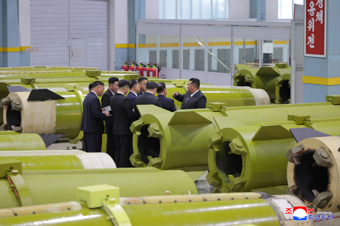 North Korean leader Kim Jong-un (R) inspects the production of shells during his visit to major munitions industrial enterprises, in this undated photo released by the North's official Korean Central News Agency on Dec. 26, 2025. Kim called for building new munitions factories to expand the production capacity of missiles and shells, the KCNA reported, without elaborating on the date of his inspection and the factories' location. (For Use Only in the Republic of Korea. No Redistribution) (Yonhap)