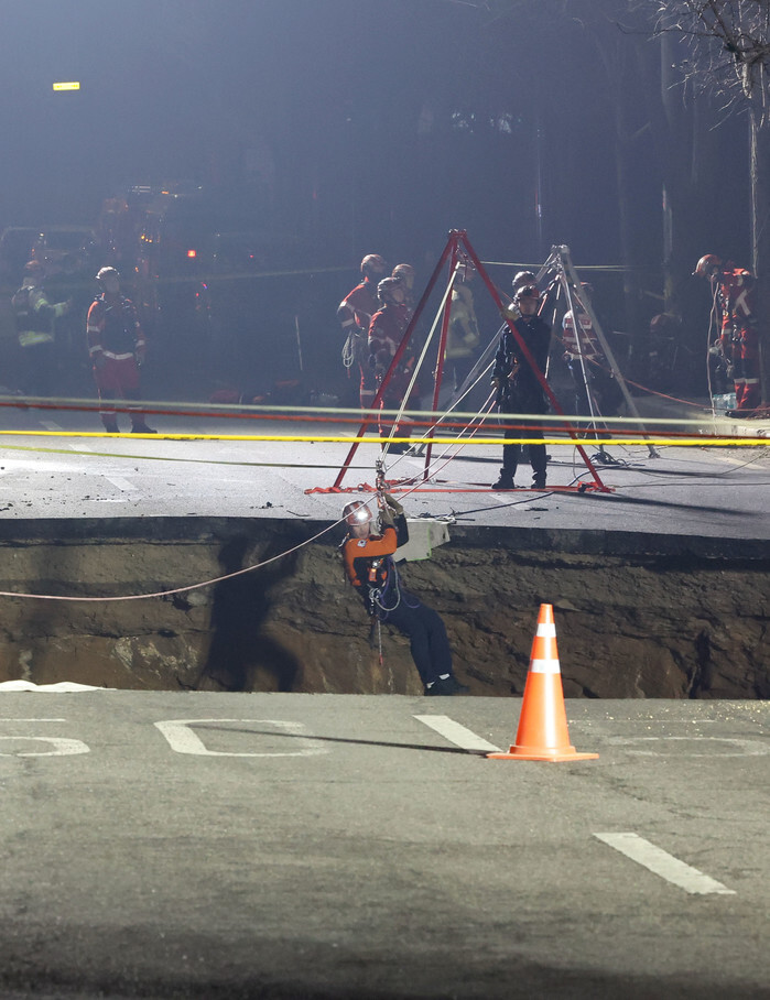 Rescue operations are under way at a 20-meter-wide sinkhole at an intersection in Seoul's Gangdong Ward on March 24, 2025, after it opened and swallowed a motorcyclist. (Yonhap)