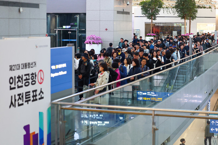 Outbound travelers wait in line to cast early votes at a polling station inside the departure lobby of Incheon airport, west of Seoul, on May 29, 2025, for the June 3 presidential election. (Yonhap)