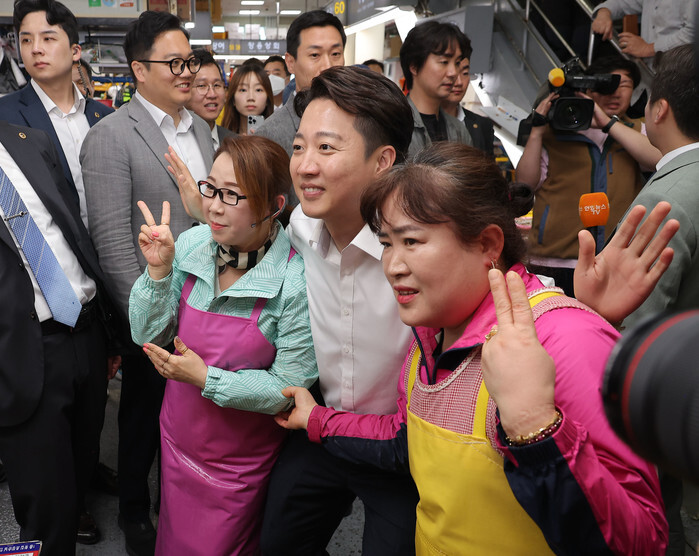 Lee Jun-seok (C), the presidential candidate of the minor conservative New Reform Party, takes a photo with shopkeepers during a stump stop at Jagalchi Fish Market in the southeastern port city of Busan on May 14, 2025, ahead of the June 3 presidential election. (Yonhap)