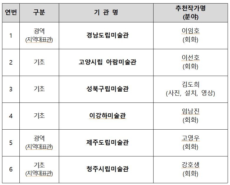 올해는 공모 심사를 거쳐 ▲ 경남도립미술관-작가 이임호 ▲ 고양시립 아람미술관-작가 이선호 ▲ 성북구립미술관-작가 김도희 ▲ 이강하미술관-작가 임남진 ▲제주도립미술관-작가 고영우 ▲ 청주시립미술관-작가 강호생을 지원 대상으로 선정했다.