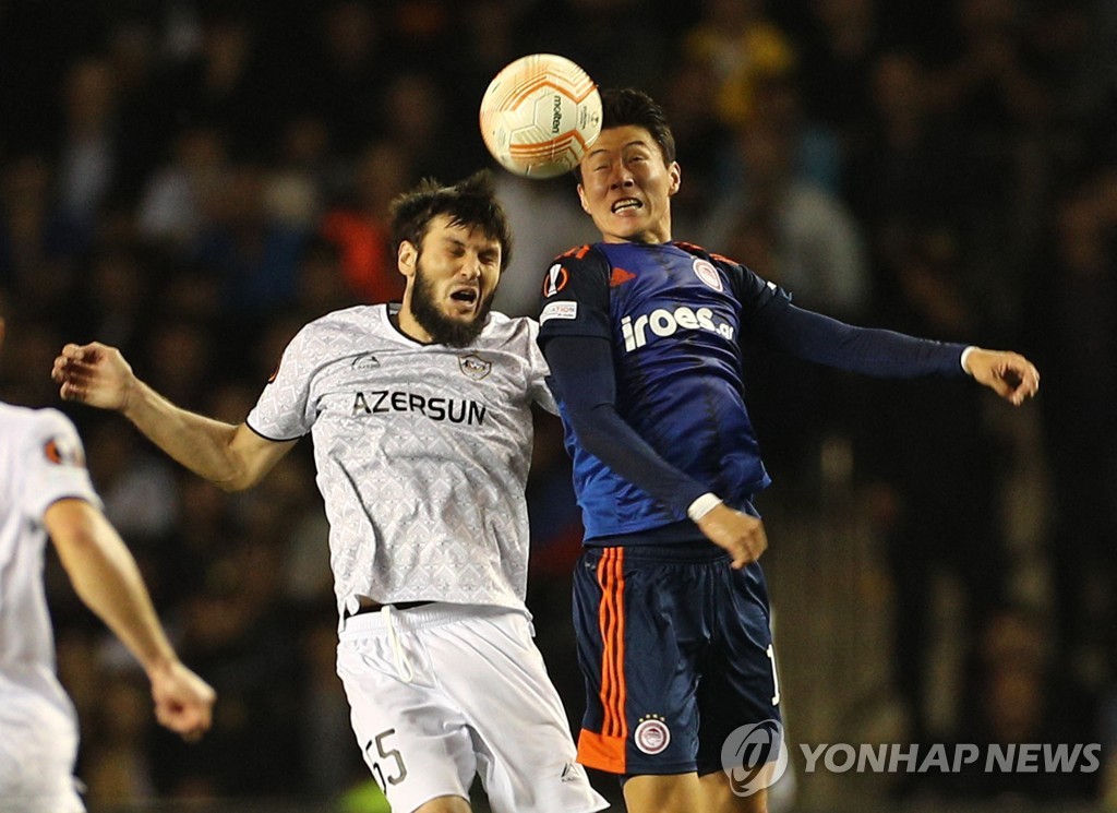 | ▲ 카라바흐 전에서 공중볼을 다투는 올림피아코스 황의조(오른쪽). [로이터=연합뉴스] |