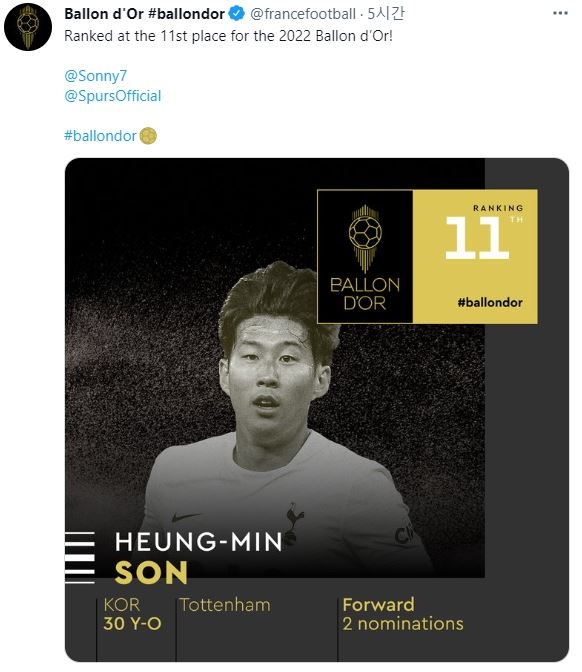 | ▲ 발롱도르 11위에 오른 손흥민 [발롱도르 트위터 캡처. 재판매 및 DB 금지] |