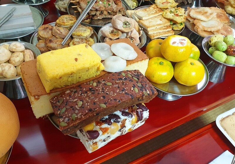 | ▲ 차례상에 올라간 카스텔라 등 빵과 둥근 모양의 송편 [촬영 전지혜] |