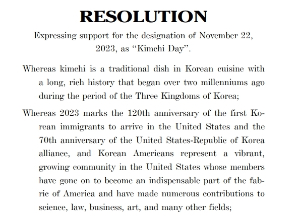 | ▲ 연방하원에 재발의된 김치의 날 제정 결의안 [미주한인이민사박물관 제공] |