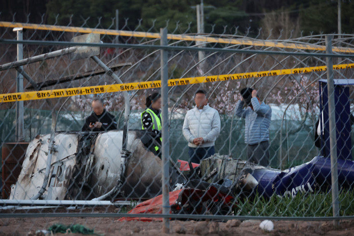 Police officers examine the site of a firefighting helicopter crash in the southeastern city of Daegu on April 6, 2025. The pilot of the helicopter, deployed to extinguish a wildfire in the city's northwestern district, was killed. (Yonhap)