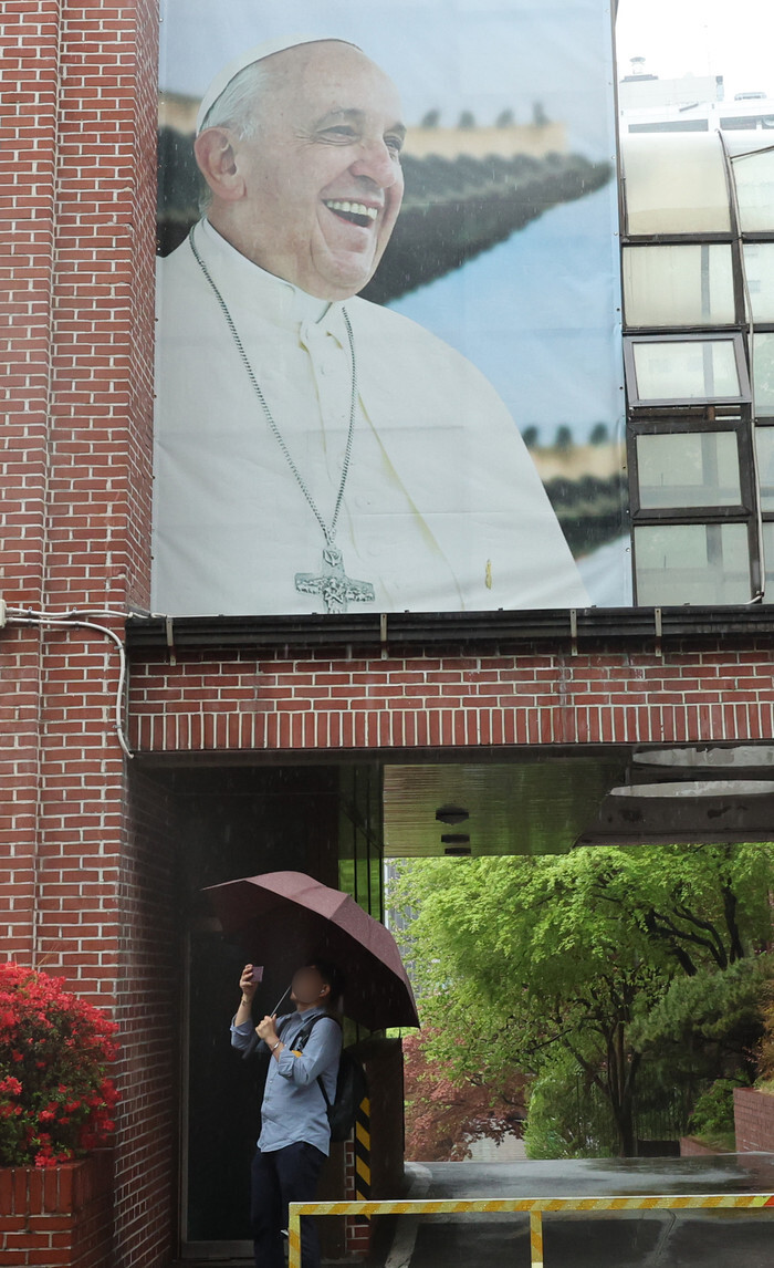 A portrait of the late Pope Francis is put up at the wall of Myeongdong Cathedral in Seoul on April 22, 2025, after his death the previous day. The first pontiff from Latin America and the first Jesuit pope died at the age of 88. (Yonhap)