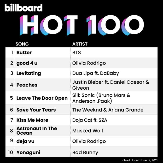 | ▲ This image, shared on Billboard's official Twitter account, shows this week's Billboard Hot 100 chart. BTS secured the No. 1 spot on the Billboard main singles chart for the third straight week with its latest single "Butter" on June 15, 2021. (PHOTO NOT FOR SALE) (Yonhap) |