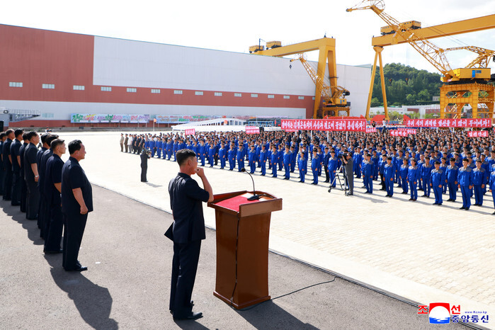 North Korean workers hold a rally at a dockyard in the western coastal city of Nampho on July 21, 2025, vowing to build an additional 5,000-ton destroyer by Oct. 10, 2026, following the launch of two such military vessels earlier this year, in this photo released by the North's official Korean Central News Agency the next day. In North Korea, Oct. 10 marks the anniversary of the founding of the ruling Workers' Party of Korea. (For Use Only in the Republic of Korea. No Redistribution) (Yonhap)