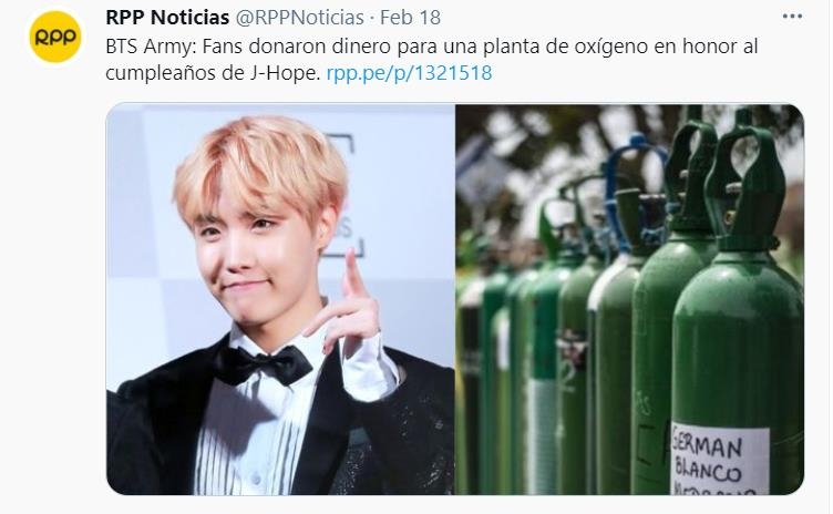 페루 '아미'(BTS의 팬)들이 BTS 멤버 제이홉의 생일을 맞아 산소공장 건립에 힘을 보탰다는 것이다.