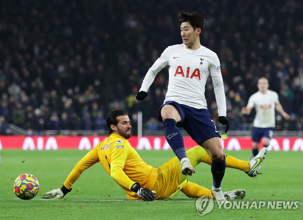 | ▲ In this Reuters photo, Son Heung-min of Tottenham Hotspur (R) scores past Liverpool goalkeeper Alisson (L) during the clubs' Premier League match at Tottenham Hotspur Stadium in London on Dec. 19, 2021. (Yonhap) |
