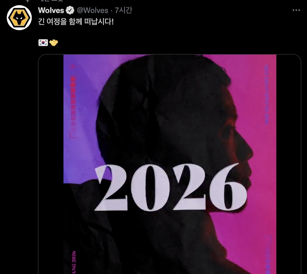 울버햄프턴은 트위터를 통해서도 황희찬의 완전 영입을 알리면서 '긴 여정을 함께합시다'라는 한글 문구와 함께 계약 만료 시점인 '2026년'을 강조하는 영상을 올렸다.