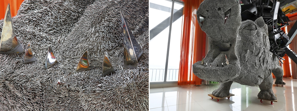| ▲ 나무로 된 하마 모양의 프레임에 스테이플러 칩을 하나하나 박아 완성한 양태균 작가의 작품. 자연과 인간의 관계에 관한 메시지를 던진다. [사진/전수영 기자] |